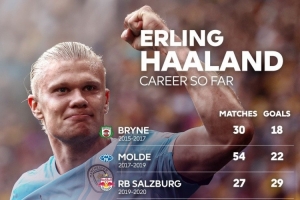 哈兰德职业生涯至今进球分布: